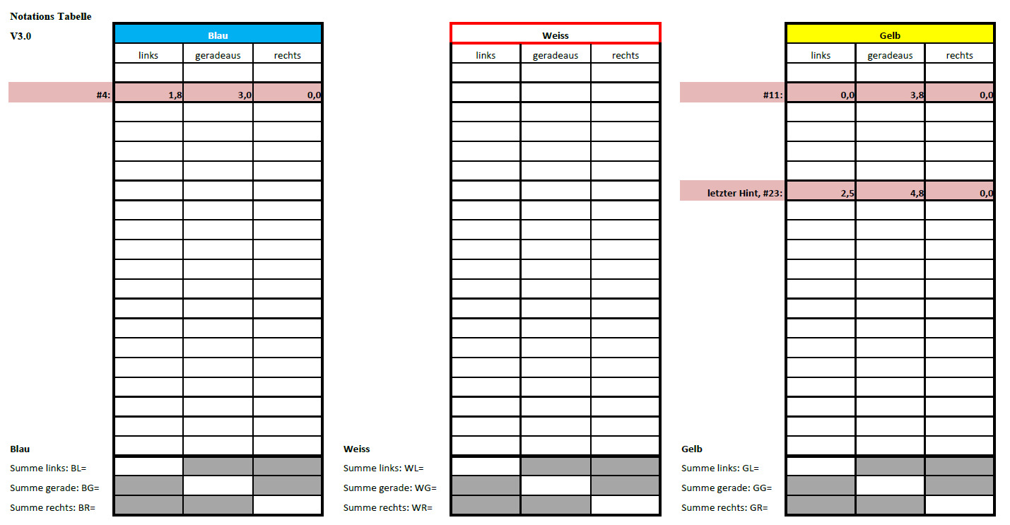 Für die Berechnung zum Schluss ist es notwendig dass du alle Zahlen die du notiert hast den Kategorien: links, rechts und geradeaus sowie den unterschiedlichen Farben zuordnen kannst! Als Hilfe für die Zahlennotation habe ich eine Tabelle vorbereitet: (Notations Tabelle)
