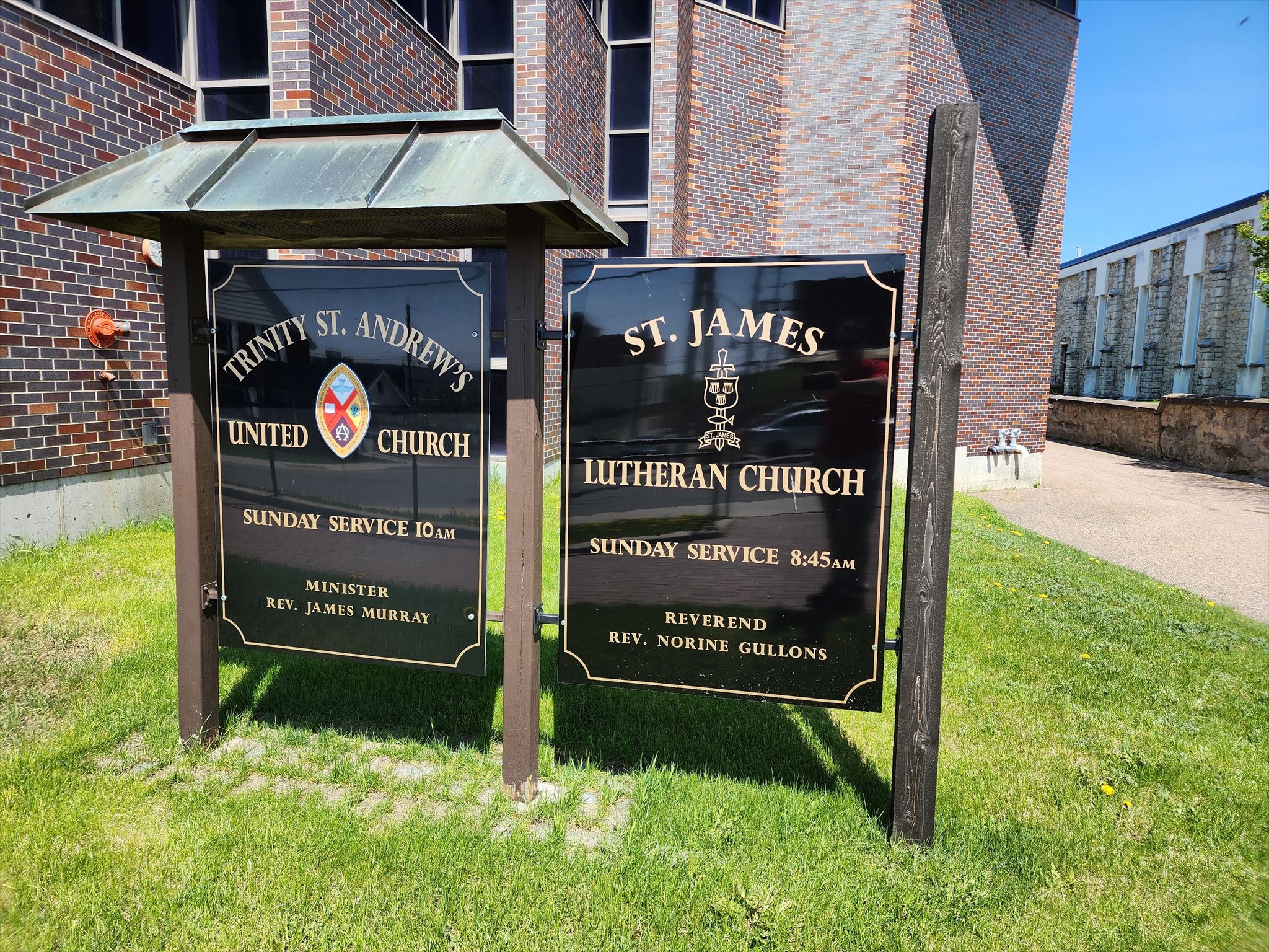 Their church was torn down and they moved in with the United Church. Look for a white circular bell on the brick wall with writing on it. Take the last word and count the letters. Multiply the number of letters by 300, and then add 160.