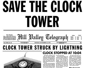 "Save the clock tower! Save the clock tower. Mayor Wilson is sponsoring an initiative to replace that clock. Thirty years ago, lightning struck that clock tower, and the clock hasn't run since. We at the Hill Valley Preservation Society think it should be preserved exactly the way it is, as a part of our history and heritage!"