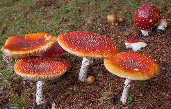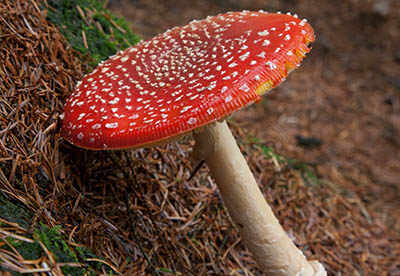 The Fly Agaric, Amanita muscaria, is a hallucinogen and must be considered poisonous. These attractive fungi often appear in groups and are a common sight in all kinds of woodlands. When they first emerge from the leaf litter of the forest floor, the young fruitbodies are covered entirely in pointed white warts. As the caps expand the red pellicle shows through until eventually the cap comprises mainly red skin with white warts distributed more or less evenly across its surface in the way shown on the photograph. Heavy rain or even contact with animals is sometimes sufficient to remove some or all of the white flakes from the cap of a Fly Agaric, so you may see some 'bald' specimens.