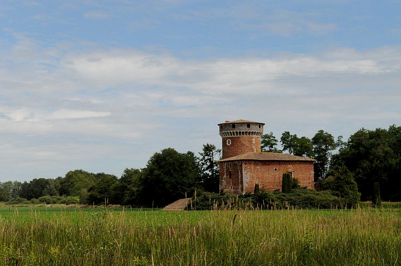 La tour massive, ronde en briques rouges, est haute de 19 m.