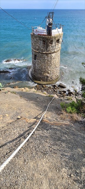 This old fortification locally known as "Saracen Tower" is located in the middle of the sea near Imperia, at the base of a steep cliff. A fabulous site. You can reach it by a steep, slippery path, from the road above. You can climb the tower and have a great view on the old city of Imperia.