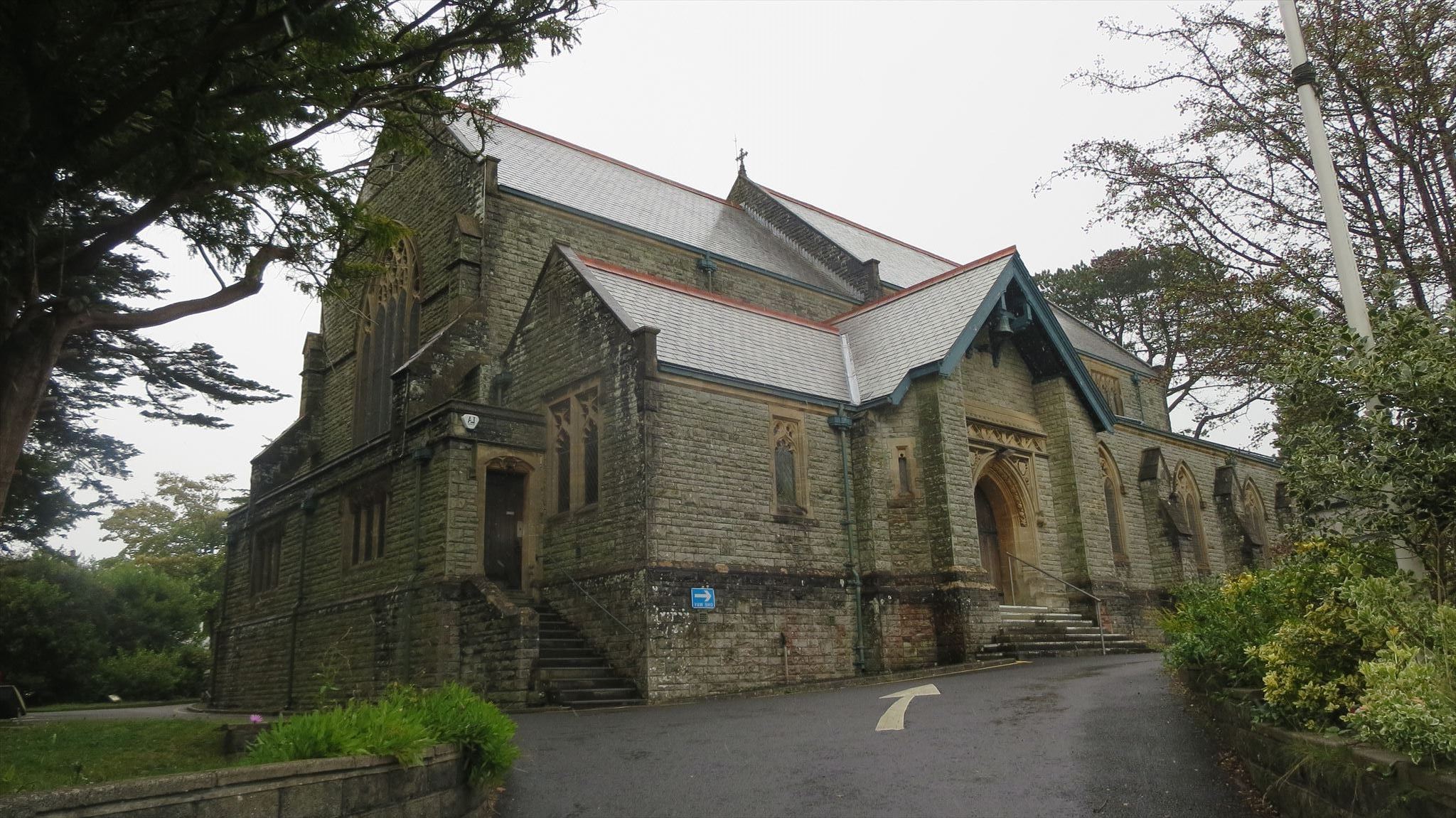 St Peter's church is located on the south side of Caswell Road at its junction with Nottage Road. It was built in 1901-3 in Decorated style to designs of E.M.Bruce Vaughan, and is constructed of greenish Bridgend Sandstone, rock-faced walling inside and out, and Bath stone dressings under slate roofs. It consists of a short-aisled three-bay clerestoried nave and a richly appointed chancel which features a high and wide arch. The aim to build a south-east tower was only partly realised. Stained glass includes works by Kempe & Tower (1912), Whipple & Co (1960s) The Church Is Open Daily