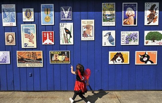 Stamp Panorama is a friendly two-part cache that kids will enjoy solving with parents. The initial coordinates take you to the south side of the post office. There you'll find the entire wall covered with dozens of large 'stamps' painted by over 45 local artists, ranging in age from 11 to 80 years old. Before proceeding to solve the cache, take time to enjoy the mural. This community project, completed in July 2011, features postage stamp art from throughout American history.