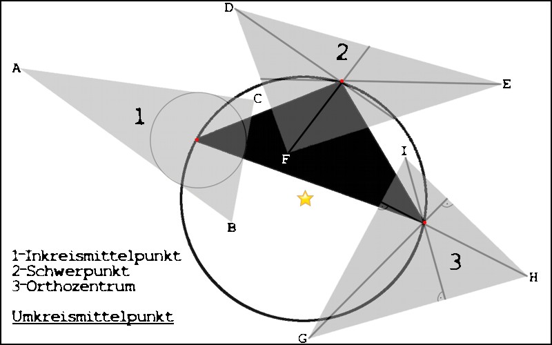 Mit den 9 Koordinaten (A-I) von oben, (wenn ihr es entschlüsselt habt), müsst ihr noch folgende Berechnungen durchführen, welche euch unten das Bild mit den vielen Dreiecken zeigt.