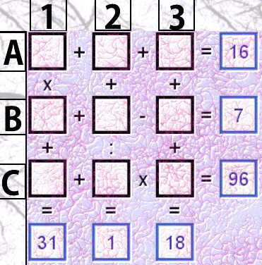 Regeln: In die leeren Felder des Diagramms sind die Zahlen von 1 bis n (= Anzahl der Felder) einzutragen, wobei jede Zahl genau einmal verwendet werden muss und alle Gleichungen korrekt sein müssen. Die Rechenoperationen sind strikt von oben nach unten und von links nach rechts durchzuführen; die Regel "Punktrechnung vor Strichrechnung" ist außer Kraft gesetzt (3+5x2=16 und nicht 13). Kein Zwischenergebnis darf negativ werden; alle Divisionen müssen ganzzahlig ohne Rest aufgehen.