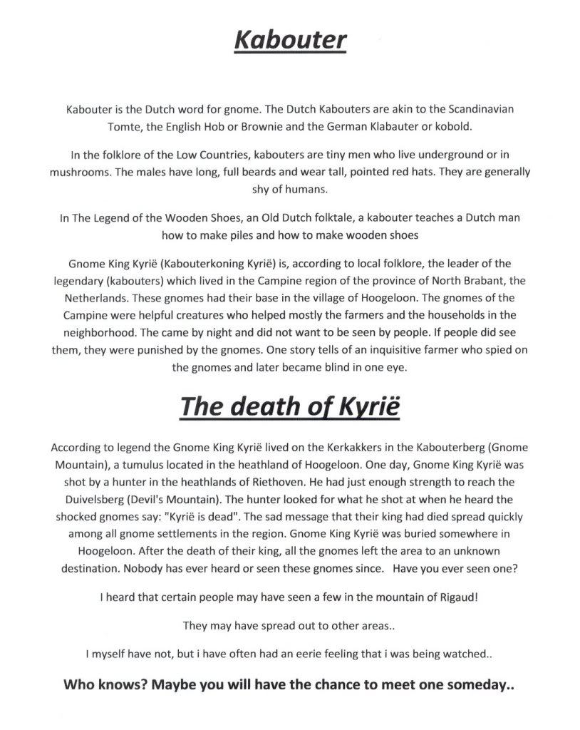 Kabouter est le mot néerlandais pour gnome. Il est semblable aux Tomte scandinaves, les Hob anglais ou Brownie, et le Klabauter ou Kobold allemand. Dans le folklore des Pays-Bas, les kabouters sont de petits hommes qui vivent soit sous terre ou dans les champignons. Les mâles ont une longue barbe, un chapeau pointu rouge. Ils sont généralement timides des êtres humains. Dans La légende des chaussures en bois, un vieux conte néerlandais, un kabouter enseigne à un homme comment faire des pieux, et la façon de fabriquer des chaussures en bois. Le roi gnome Kyrië (Kabouterkoning Kyrië) est, selon le folklore local, le roi des légendaires kabouters qui vivait dans la région de la Campine de la province du Brabant-Septentrional, Pays-Bas. Ces gnomes avaient leur base dans le village de Hoogeloon. Les gnomes étaient des créatures timides qui aidaient principalement les agriculteurs et les familles des environs. Ils venaient la nuit et ne voulaient pas être vus par les gens. Si les gens les voyaient, ils étaient punis par les gnomes. Une histoire raconte qu’un agriculteur curieux, qui espionnait les gnomes, est devenu aveugle d'un œil. La mort du Kyrië Selon la légende, le roi gnome Kyrie vécu sur le Kerkakkers (La Montagne Gnome), dans un tumulus situé dans la lande de Hoogeloon. Un jour, Gnome King Kyrie a été abattu par un chasseur dans les landes de Riethoven. Il avait juste assez de force pour atteindre la Duivelsberg (la Montagne du Diable). Le chasseur cherche ce qu'il a tiré quand il a entendu les gnomes choqués dire: "Kyrie est mort". Le triste message que leur roi était mort c’est rapidement répandu parmi toutes les colonies gnomes dans la région. Le roi Kyrie a été enterré quelque part dans Hoogeloon. Après la mort de leur roi, tous les gnomes ont quitté la région vers une destination inconnue. Personne n'a jamais vu ou entendu ces gnomes depuis! Vous…, en avez-vous déjà vu? J’ai entendu dire que certaines personnes en auraient vu dans la montagne de Rigaud ! Ils ont sûrement agrandi leur territoire. Personnellement, je n’en ai jamais vu, mais j’ai souvent eu l’étrange sentiment qu’on me surveille…. Qui sait? Peut-être que vous en rencontrerez un jour. English version click here (LINK)