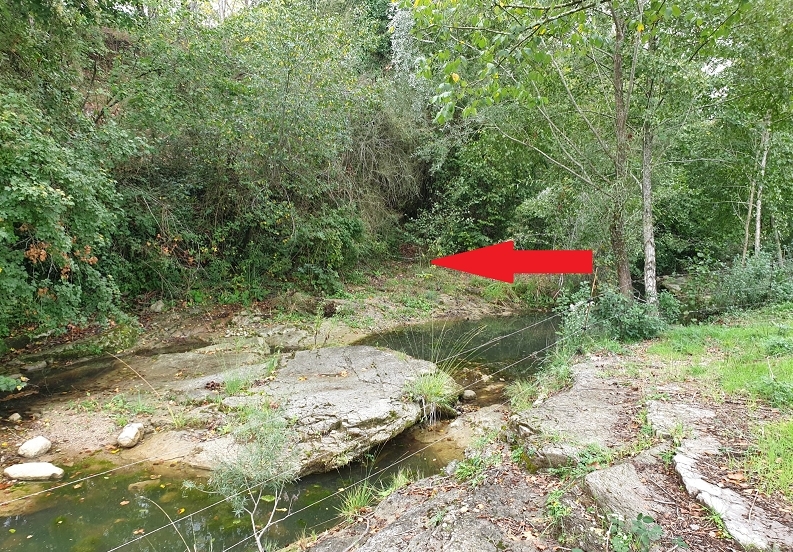 [en] Keep going down and, once in the river, you only have to find the little path which goes up to the fountain. You have to cross the river by foot and, once on the other side, walk some meters and you will see the path. See the arrow in the next picture.