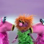 Mahna Mahna is a purple Muppet with messy orange hair and a furry green tunic who is most famous for performing the nonsense song, “Mahna Mahna” with the Snowths, pink, cow-like creatures with round yellow lips. The first Muppet version of the song debuted on The Ed Sullivan Show in 1969 and was re-staged a number of times on variety shows before being featured as the opening number in the premiere episode of The Muppet Show. The performance always follows the same pattern: Manha Mahna starts out following the structure of the song, but falls into improvisational scat whenever possible. The Snowths, know for their do-doo-doo-do back-up, attempt to bring order to the number, but their efforts are always futile.