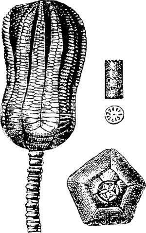 Alle Steinbrüche des Muschelkalks sind - wie hier am Fischerberg - im Bereich des oberen Muschelkalks, des sogenannten Trochitenkalkes, angelegt. Die namensgebenden Trochiten sind kleine tonnenförmige Stielglieder der Seelilie (Encrinus liliiformis).