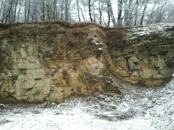 In der rechten, südlichen Steinbruchwand ist eine interessante Verwerfung sichtbar: die talwärts gerichtete Scholle ist um einige Meter in die Tiefe versetzt worden.