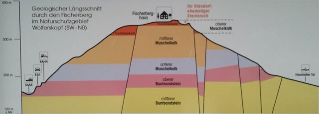 Der Steinbruch am Fischerberg bietet einen einzigartigen Einblick in die geologische Struktur des Naturschutzgebietes Wolferskopf. Er zeigt eine Gesteinsserie aus dem oberen Muschelkalk.