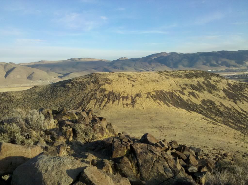 Huffaker Hills, part of the Kate Range is volcanic. It is comprised of Rhyolitic lava erupted 8 to 25 million years ago from vents that opened up along the fault system that runs through here (CITATION: GEOLOGICAL SURVEY BULLETIN 1042-C, Geology of the Virginia City Quadrangle, Nevada by GEORGE A. THOMPSON).