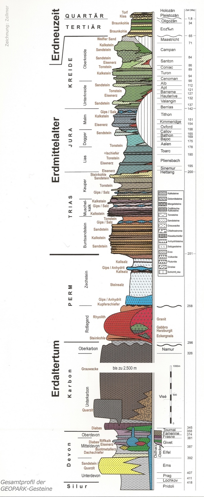 Direkt auf den verfalteten und von tektonischen Störungen durchsetzten Schichten der Devon- und Karbonzeit zeigt uns ein Aufarbeitungshorizont, das Zechstein-Konglomerat, die Kraft des schnell anbrandenden Wassers. Darüber befindet sich der fossilreiche Kupferschiefer mit seinen Jahrtausende lang begehrten Erzen. Es schließt sich aufliegend ein dolomitischer Zechsteinkalk an. Innerhalb einer Handspanne berichten diese unterschiedlichen Gesteine von der Entstehung und den unterschiedlichen Phasen eines Meeres der Permzeit.