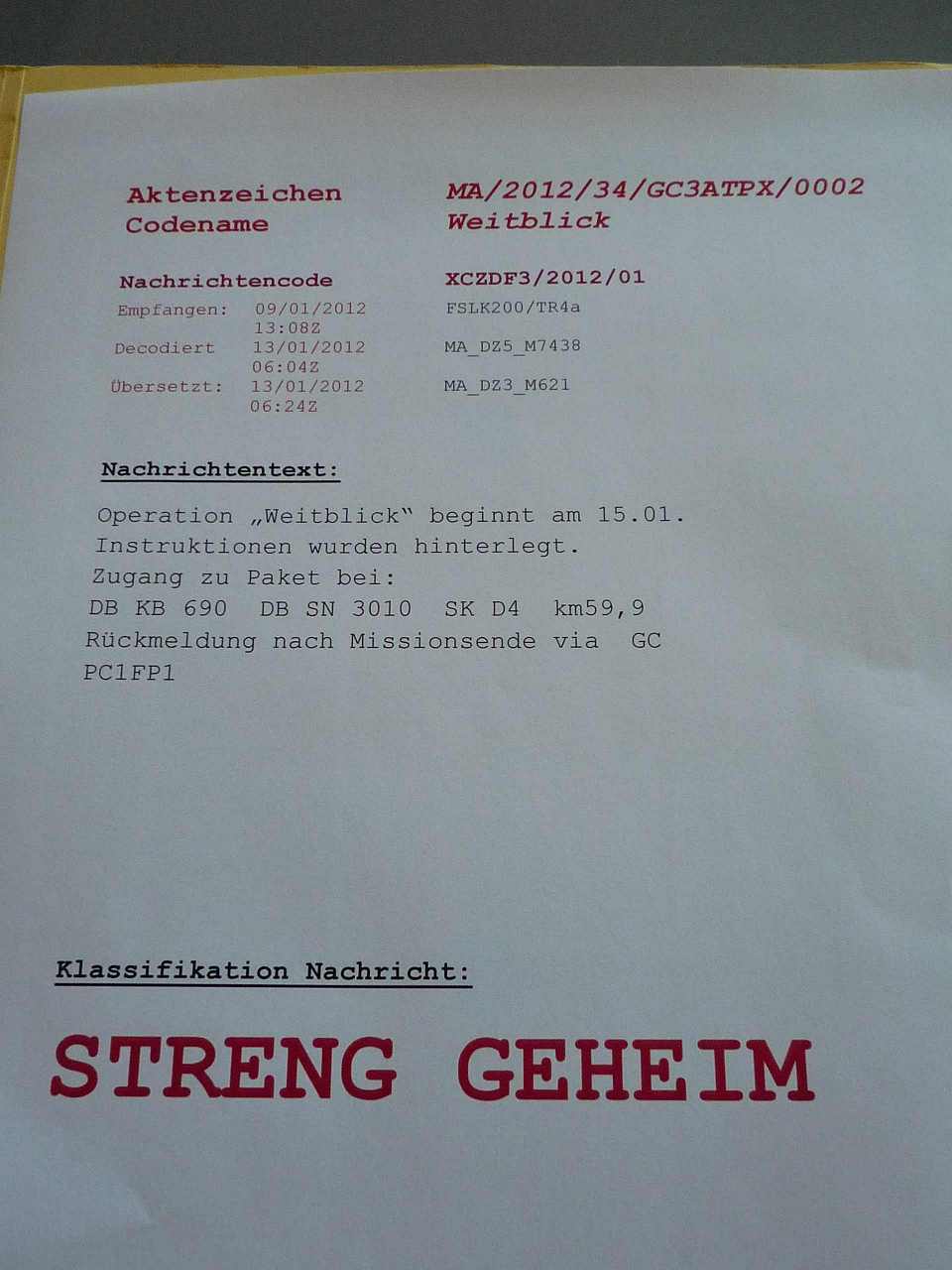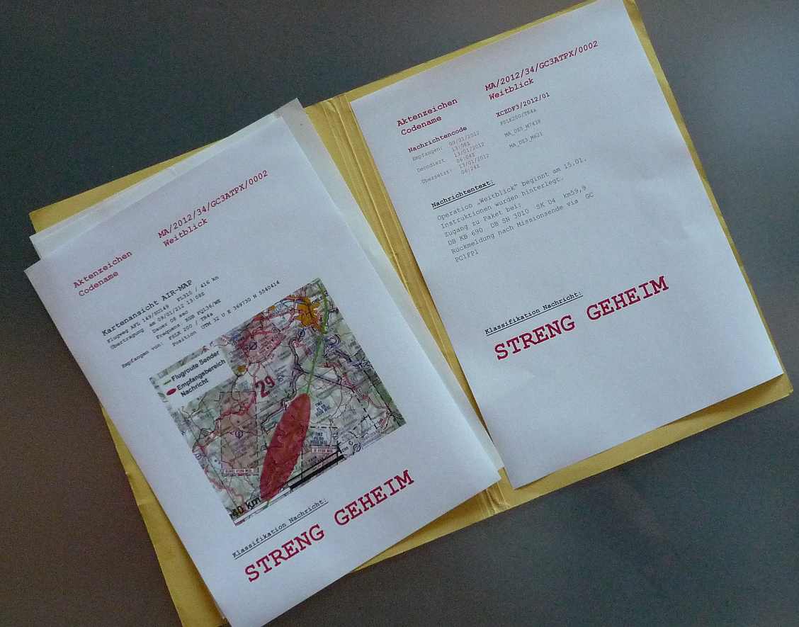 Aus der übermittelten Nachricht konnten wir erkennen das es sich um die Anweisung für einen Agenten handelt sich sein Informationspaket abzuholen. Leider wurden keine genauen Koordinaten übermittelt sondern der Ort verschleiert. - Herr Nering bitte"; damit übergab Vogel nun das Wort an Nering und legte die Akte mit der Karte auf den Tisch.