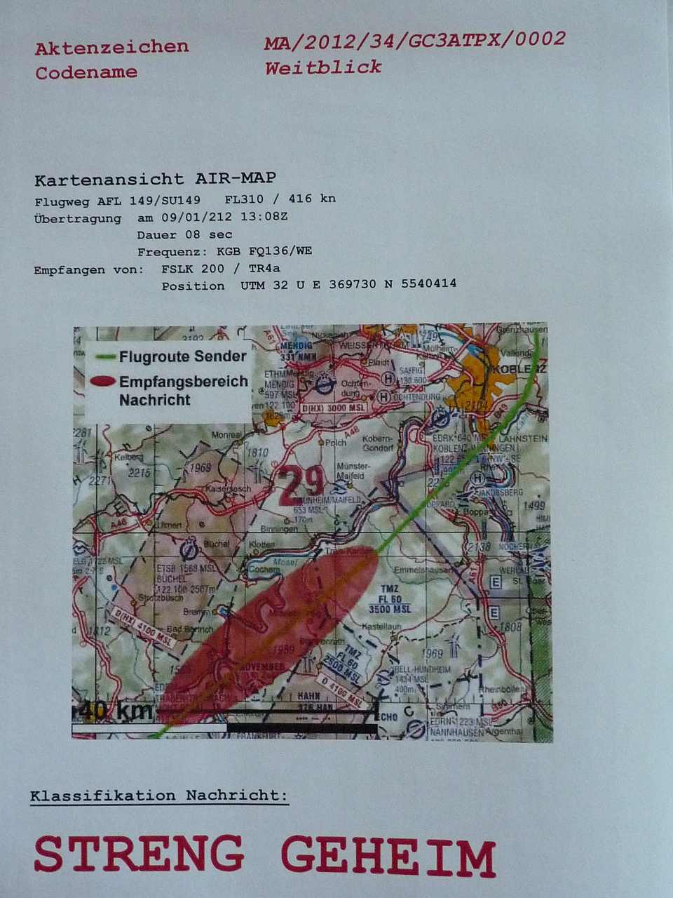 "Meine Herren, Herr Oberst Schmitz hat uns ja bereits vorgestellt, wir sind von der Militärischen Aufklärung Dezernat 2. Vor 4 Tagen haben während einer Übung Fernspäher im Hunsrück eine Signalübertragung auf einer ehemaligen KGB-Frequenz empfangen. Unsere Analytiker haben den Code knacken können so das wir die Übermittlung dekodieren konnten.