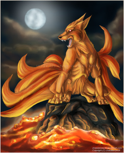Kyuubi é uma Kitsune gigantesca e com a habilidade de falar, sendo o Bijuu (criatura imensa com concentrações massivas de Chakra) que representa Nove Caudas. Ela foi criada a partir da Juubi onde o chakra deste monstro foi divido em 9 partes, dando origem aos Bijuus.