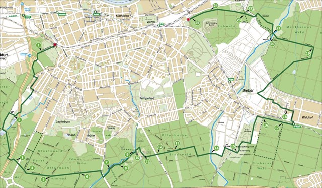 Auch der Offenbacher Stadtteil Waldheim ( ex-Lohwaldsiedlung) liegt nahe der Waldroute. Die Lage der Siedlung am Wald ist namensgebend für Waldheim gewesen. 1911 wurde die Landhauskolonie Waldheim gegründet. „An den Eichen“ ist ein neuer Stadtteil benannt. Er liegt nur 200 Meter entfernt von hier. Das 16,8 Hektar große Baugebiet gibt 1 200 Menschen ein neuesZuhause. 120 Grundstücke sind erschlossen. Die Eiche ist ein Symbol der Stadt Offenbach. Das Stadtwappen symbolisiert einen silbernen Eichenbaum mit fünf Eicheln auf blauem Grund. Es nimmt Bezug auf den ehemaligen Reichsforst Dreieich (Drei-Eichen), zu dem Offenbach und das halbe Rhein-Main-Gebiet im Mittelalter gehörten.*