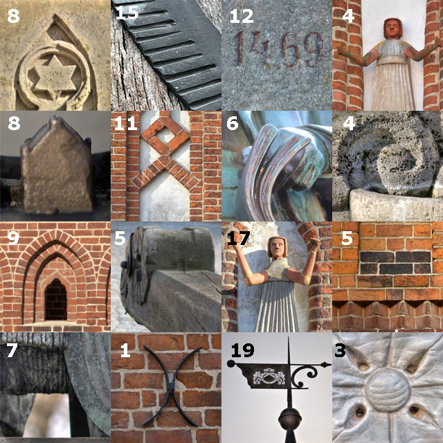 Die Koordinaten an den Sehenswürdigkeiten zeigen auf markante Punkte des jeweiligen Bauwerks, keinesfalls genau auf die Stelle, an der gesucht und zugeordnet werden muss. Schaut genau hin! Die Größenverhältnisse auf den Fotos sind kein Anhaltspunkt! Manchmal muss man weiter oben, manchmal auch weiter unten suchen. Hin und wieder könnte es hilfreich sein, um die Ecke zu schauen. Wichtig ist, die Zahl, welche im Fotoausschnitt steht, der jeweiligen Sehenswürdigkeit zuzuordnen.