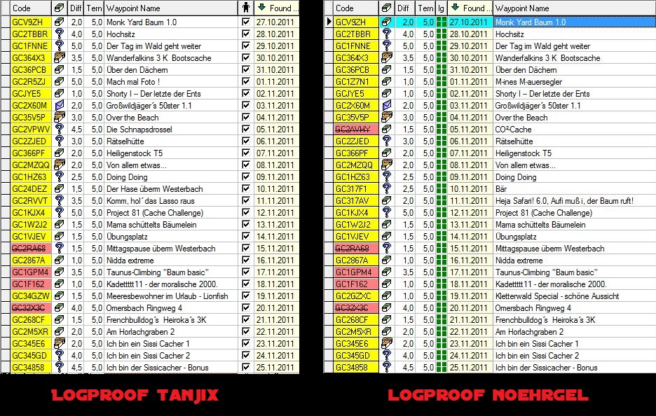 In eurem Online-Log weist ihr bitte nach, das ihr die Aufgabe erfüllt habt. Dies kann entweder durch eine öffentliche Bookmark-Liste oder der Nennung der jeweiligen GC-Nummern und dem dazugehörigen Fund-Datum erfolgen. Selbstverständlich sind auch andere Formen des Nachweises möglich, z.B. der Screenshot Eurer GSAK-Datenbank für den fraglichen Zeitraum.