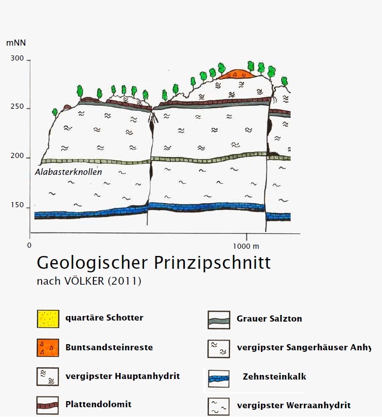 In den Warmzeiten des Pleistozäns wurde der Gips soweit abgetragen, dass direkt am Harzrand nur noch die unterste Schicht, der Werra-Anhydrit, übrig blieb.