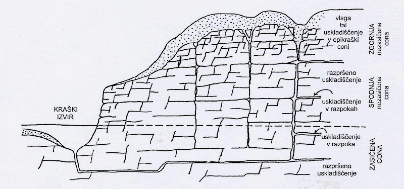 Kraški vodonosnik lahko razdelimo na tri dele, in sicer: zgornjo nezasičeno cono, ki vključuje vodo uskladiščeno v tleh in v epikraški coni, spodnjo nezasičeno cono, ki vključuje cono uskladiščenja v kraških kanalih in večjih razpokah ter v okoliških blokih kamnin, ter zasičeno cono, ki prav tako vključuje cono uskladiščenja v kraških kanalih in večjih razpokah ter v okoliških blokih razpokanih kamnin.