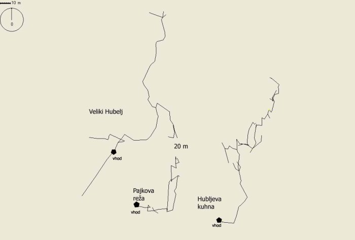 Morphology of the three caves is very similar. The input shafts are located in the east-west direction and are of slightly larger dimensions. Internal parts of the caves are mostly vertical cracks around the north-south direction. All three caves were created along secondary faults. Passages of large dimensions have been generated by rockfalls. Elevated passages that water seldom or never reaches are in some places full of calcareous sinter. Halls in Veliki Hubelj and in Hubljeva kuhna, which lie the deepest in the massif, are very muddy. It seems that there the water rises through the holes in the bottom and deposits mud in the process. The water there rises due to the barriers that prevent the outflow of large amounts of water. It is likely that barrier is a demolished zone at the fault.