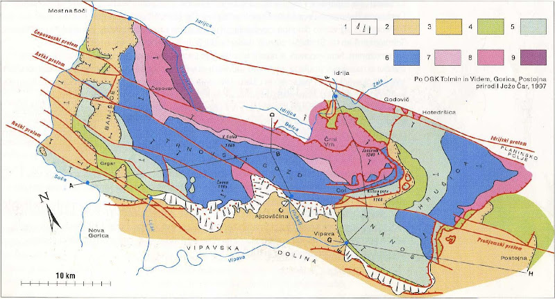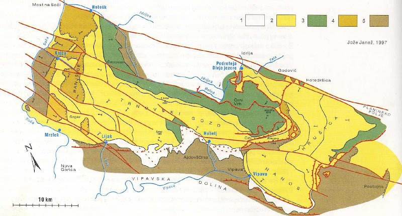 The High Karst area consists of Cretaceous and Jurassic limestones and upper Triassic dolomites belonging to Trnovo and Hrušica cover the thrust structure of western Slovenia. Carbonate rocks are thrust into layers of Eocene flysch; thrust blocks are fractured and tectonically moved along the longitudinal and transverse faults. The western part of the High Karst is between Idrijca and Vipava 10 to 15 km wide, between Soča and Pivka it is about 50 km long and covers approximately 700 km2 of karst terrain, which is practically surrounded on all sides with the lower river fringes. Flysch rocks surround the karst limestone as a partial or complete hydrogeological barrier on the west, south and east sides. On Banjšice plateau, in the western part of the High Karst, flysch is preserved as a thin cover. In some parts the karst base is breaking through it, but mostly it acts as a hanging hydrogeological barrier, below which the characteristic karst streams of water can be found. On the north side the High Karst is surrounded by impermeable middle and lower Triassic, Permian and Carboniferous rocks. Idrijca and its tributaries Belca, Zala, Kanomljica, Hotenja and Trebušnica have formed their surface channels there.