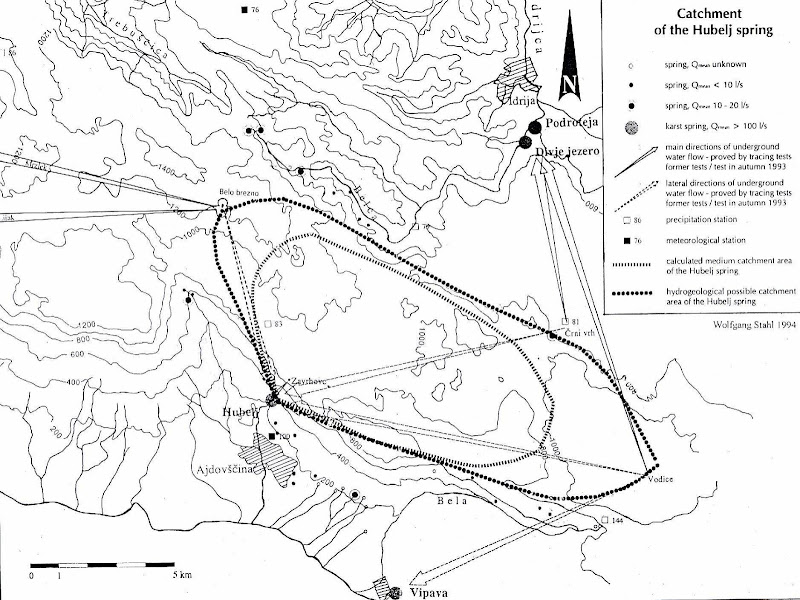 Karst spring of Hubelj River is located high above the valley. Hubelj lies on the bottom of a distinctive, narrow and deep structural depression in the thrust plane of Trnovo cover. In the dry season several siphon lakes are retained in the caves behind the spring. Water flows in between poorly permeable limestones and flysch base. The Hubelj source occurs at the highest altitude of all the springs in the area. It lies on the southern border of Trnovski gozd. At high water the water level rises for 40 m. Flow of Hubelj varies from 0.2 to 59 m3 / s, while its mean flow is 3 m3 / s. Behind the source is the high Karst plateau of Trnovski gozd with the average height of 900 m. This area gets an average of 2450 mm of rainfall per year. The catchment area of the Hubelj spring consists mainly of the Jurassic limestone and covers an area of 50 to 80 km2.