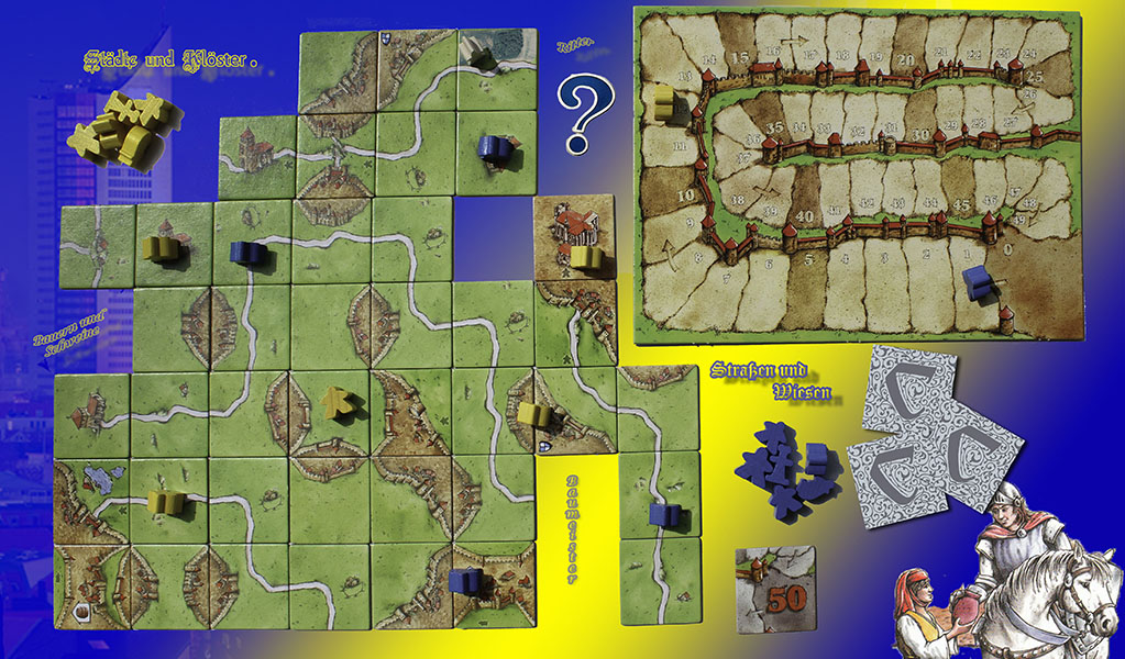 An regnerischen Tagen oder im Urlaub spielen wir sehr gern Carcassonne. Bei einen der letzten Spiele ergab sich plötzlich eine merkwürdige Konstellation. Waren da auf dem Brett plötzlich Koordinaten zu erkennen? Wir haben an dieser Stelle unser Spiel abgebrochen und entsprechend der Regeln die Punkte aufgeschrieben. Es hatte aufgehört zu Regnen, ein gutes Zeichen. So haben wir uns auf die Suche begeben. Am Ende des Tages haben wir abseits einer Straße den geheimen Ort gefunden. Nach dieser anstrengenden Suche setzten wir uns noch etwas nieder und konnten mit einem Blick über die Wiesen in der Ferne Kirchen und eine Stadt erkennen. Es war nicht Carcassonne, aber es gefiel uns auch. Wenn auch Du dieses Ort finden willst muss Du das Rätsel des Spiels lösen und dich auf die Suche begeben. Viel Spass.