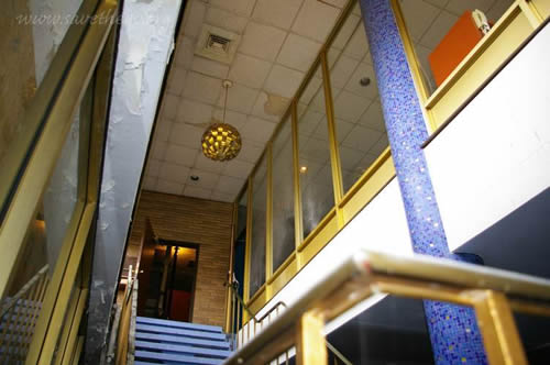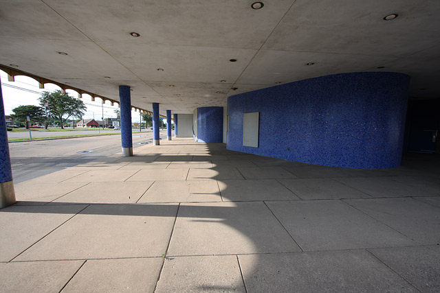 Outside, with its steel-and-glass boxy shape, gave a very Modernistic appearance and was typical Modernist architecture, but inside, as its name might imply, it carried a Roman Empire theme. Imported blue Italian tiles highlighted by glimmering gold tiles cloaked the curved exterior and columns of the Quo Vadis giving it a quiet sparkling presence.