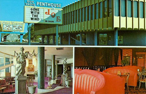 The Algiers Drive-In had been opened in 1956 on the northeast corner of Wayne Road and Warren in Westland. Business was good and the brothers wanted to expand the entertainment offerings in the area here. Their original ideas led to buying 25 acres of "swampland" near Wayne and Warren Roads, filling it with topsoil and gravel, then "planting" a Drive-In movie theatre there that would hold 1200 cars. This would be an excellent and profitable idea, but unfortunately the movies could only be shown in the evening/after dark and when weather was warm enough for folks to enjoy it. This gave the brothers an idea to devolop and build an indoor complex that would be known for being "different" and unusual and also catering to folks "higher tastes" in entertainment. Thus, the Quo Vadis was born.
