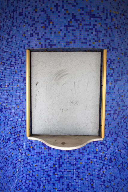 Close-up of the covered Box Office window with it's blue & gold-mosaic tiles.