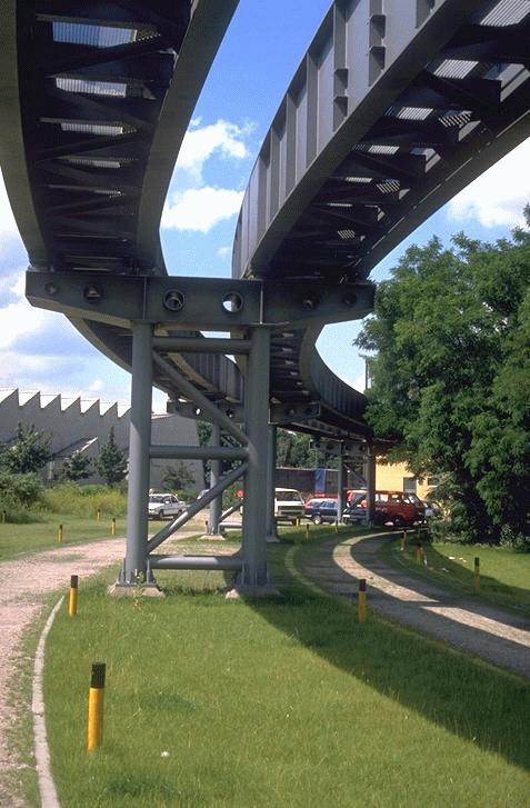 3. Die M-Bahn war ein spurgebundenes Verkehrssystem auf eigenem Fahrweg, das ab 1984 im Versuchsbetrieb und von 1989 bis 1991 im Passagierbetrieb eingesetzt wurde.
