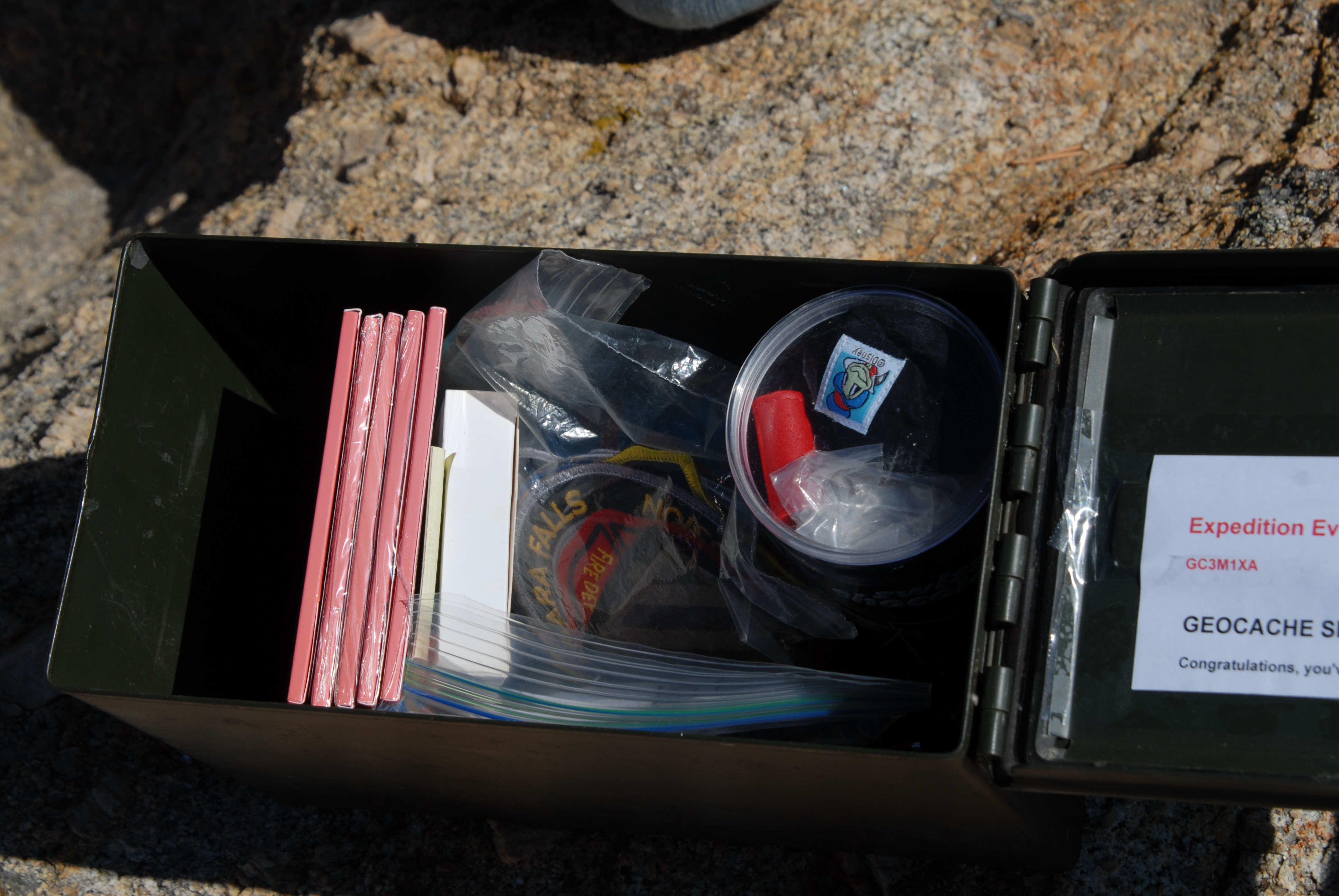 You are searching for an ammo can near the top of a mountain. Once you make it to the top there are some great views. Please be sure to place the can upright when done as the location may see lots of snow each year. Don't want that water to sneak into the container. The cache contains lots of great tradables including a patch and pin trading bag. Take the one you like to swap out with another.