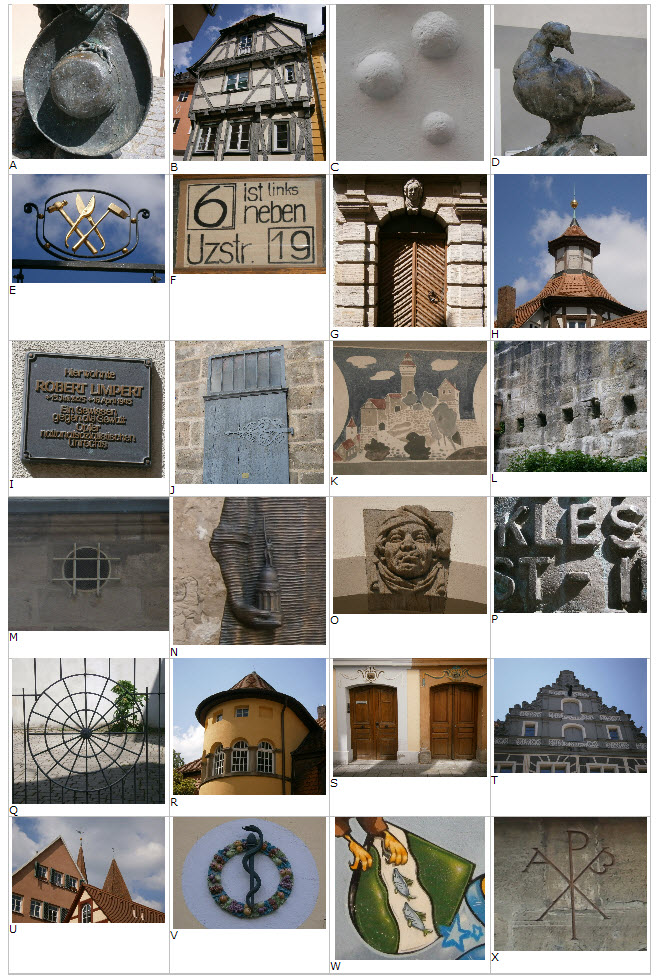 Unten findet ihr 24 Fotos, die in der Ansbacher Innenstadt aufgenommen wurden. Sucht die Orte, an denen die Fotos aufgenommen wurden. Dort findet ihr jeweils eine Zahl oder eine Inschrift, die Teil der Lösung ist.