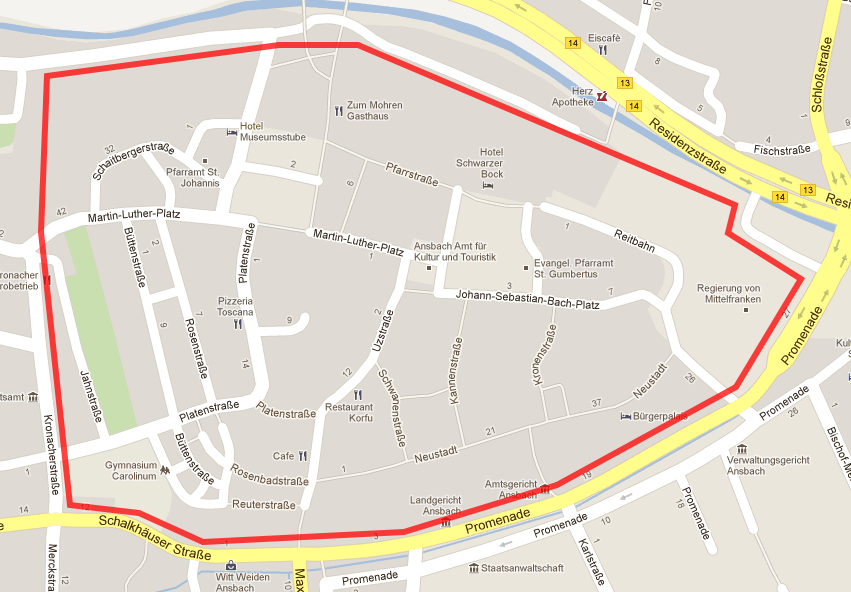 Hinweis: Von den Grenzstraßen aus sind keine Fotos erstellt worden. Ihr braucht daher z.B. die Promenade oder die Kronacherstraße nicht entlanglaufen.