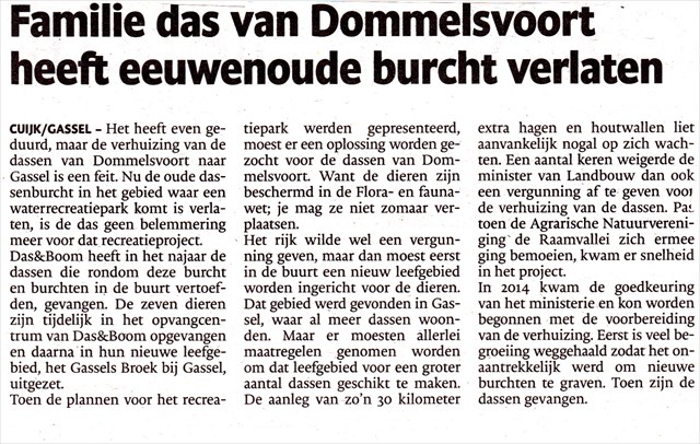 Begin maart 2014 werd bekend dat het ministerie zich niet langer verzette tegen het verhuizen van de dassen. Op 24 januari 2015 stond het volgende bericht in de krant: