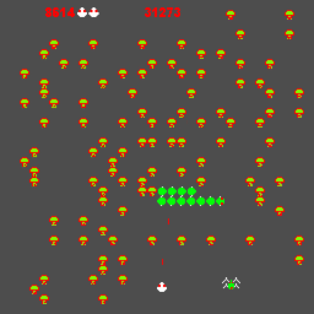 The player moved the character about the bottom area of the screen with a trackball and fired laser shots at a centipede advancing from the top of the screen down through a field of mushrooms. Shooting any section of the centipede created a mushroom; shooting one of the middle segments split the centipede into two pieces at that point. Each piece then continued independently on its way down the board, with the first section of the rear piece becoming a new head. Other enemies included a spider, a flea, and a scorpion.