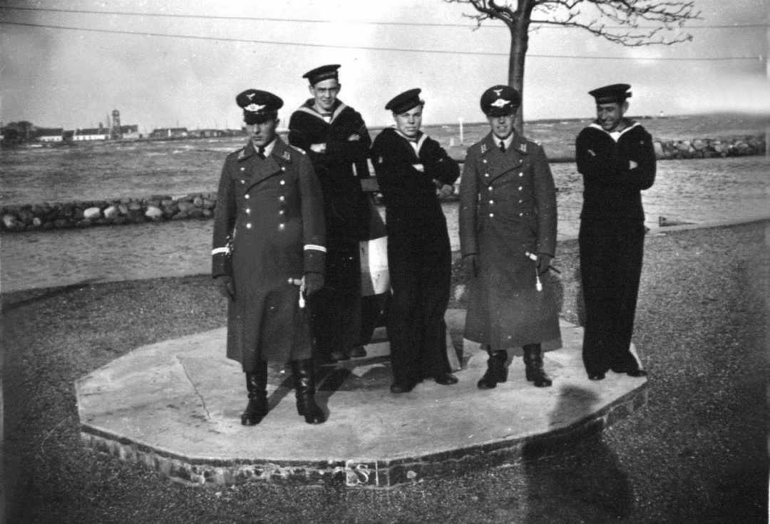 1941. Under Besættelsen var fortet besat af Den tyske Værnemagt. Tyske marineofficerer fotograferer med nogle af de danske værnepligtige, der var beordret til at servicere generatorer m.v.
