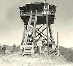 In September 1932 the Buck Peak Lookout was constructed. It was a 21-foot tower. The lookout cab was a model L-4A 14x14 foot with a hip roof. It served as a lookout until 1968 when it was no longer needed and burned by the Forest Service. Photo is circa 1940.