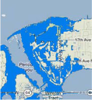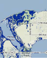 But what happens if our own activities provide a catalyst to the natural processes, speeding them up and possibly even adding to the effects? What happens in a place where we’ve lived dependent upon the Gulf, Ocean, bays, lakes, rivers, and streams, when the world’s waters change? Scientists cannot say for certain when sea level rise will occur, nor can they predict exactly what will happen. Programs like the National Estuary Programs can, however, look at past data and current trends to create models that tell us what we can expect within our area. The Sarasota Bay Estuary Program (SBEP) has worked with Mote Marine Lab, U.S. Environmental Protection Agency, ManateeCounty, and Sarasota County in order to create a map that predicts what could happen if sea level rise occurs in the local area. The model shows the current water levels at Robinson Preserve: