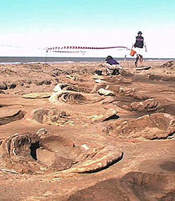 Y desde ya, no podemos dejar de nombrar el fantástico yacimiento de huellas fosilizadas, ubicado a 2500 metros al Este de la localidad de Pehuen Co, cuya edad es aproximadamente 12000 años (Pleistoceno tardío). Las huellas mas destacadas pertenecen al megaterio. El yacimiento fue descubierto en 1986 y está formado por plataformas de limos arcillosos y areniscas que suelen verse entre la arena de la playa a lo largo de unos 3 Km, exhiben numerosas huellas fósiles de aves (ñandúes, zambullidores, chorlitos, flamencos, teros, gaviotas, patos, cisnes, martinetas, perdice) y mamíferos extinguidos.