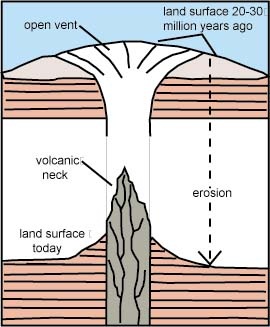 Volcanic plugs are a common intrusive formation here in the Missouri Breaks National Monument. Volcanic plugs (also known as volcanic necks) form when magma rising in a vent towards the surface cools and solidifies, creating a mass of igneous rock. Since igneous rock is hard and resistant to weathering, over time erosion wears away the surrounding softer sedimentary rock, exposing the volcanic plug and forming a prominent feature on the landscape. Sometimes, these plugs are actually the vent of an ancient volcano. The diagram below illustrates the formation of a volcanic plug through time.