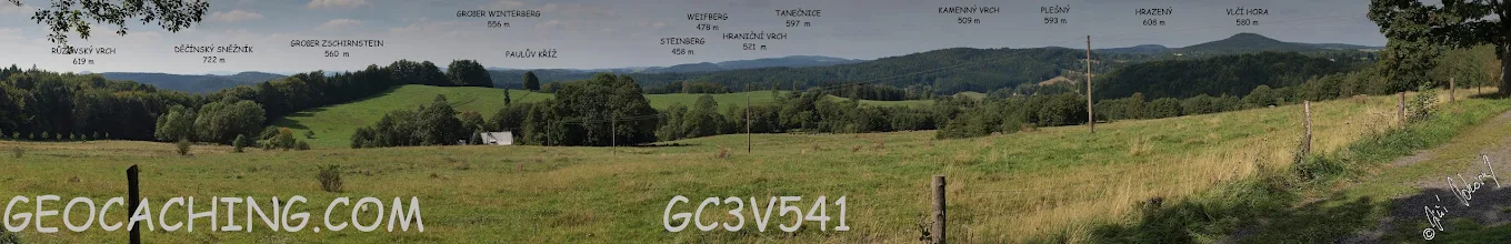 [EN] The settlement of Stone hill (Kamenna Horka) is a suburb of Krásná Lípa. There is a nice observation point at the fringe of the village near the final position of this Cache. Parking places are situated next to a yellow marked hiking trail which leads from Krasna Lipa towards the Stone hill (Kamenna Horka). You can park your car in the centre of the city or in the street Stradalova. The observation point and the trail to this point offer beautiful views over Lusatian Mountains, the peaks of Lausche (Luž) and Tannenberg (Jedlová), Krásná Lípa, its surroundings and the woods of rear Czech Switzerland, the peak of Dancer (Tanečnice), Wolf's (Vlčí) Mountain and the peak of Děčínský Sněžník. You can see half-timbered houses on your way to the cache.