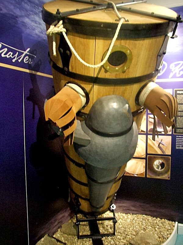 Ilustrações a partir de gravuras numa caneca gravada, contemporânea de Lethbridge, com mapa do sítio de naufrágio e o barril de mergulho utilizado nos resgates subaquáticos: