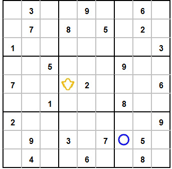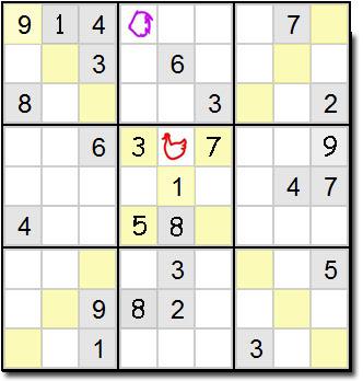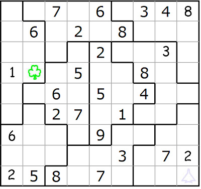 The rules for this puzzle are: every row, every column, and every "cluster" of 9 squares must contain the digits 1 through 9 only once.