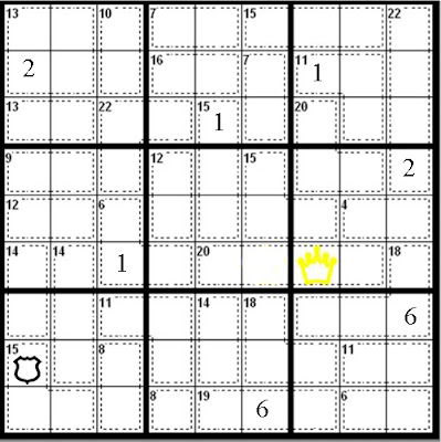 O puzzle final tem as mesmas regras do Puzzle # 1. Os quadrados nas caixas a tracejado somados devem ter como resultado o número na parte superior esquerda da caixa a tracejado.