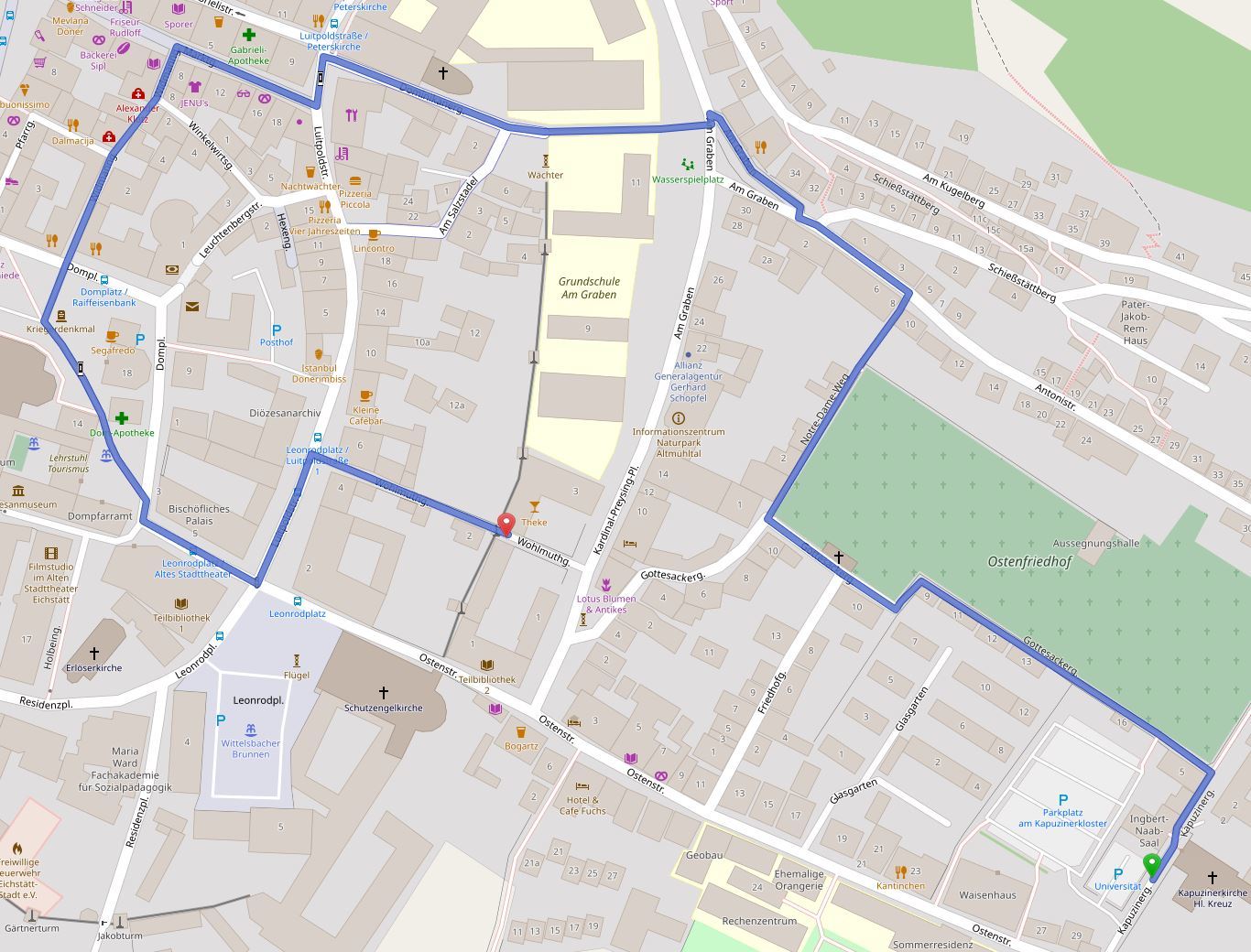 Der Spaziergang beginnt in der Kapuzinergasse am dortigen Parkplatz. Geht an der Kapuzinerkirche vorbei, links in die Gottesackergasse immer die Friedhofsmauer entlang. Bei der nächsten Möglichkeit rechts den Notre-Dame-Weg hoch bis zur Antonistraße. Von dort aus links, am Wirthaus "Zum Gutmann" vorbei, weiter die Dominikanergasse an der Grundschule Am Graben entlang. An der Kaffeerösterei Saerve links in die Luitpoldstraße abbiegen und dann gleich wieder rechts in die Marktgasse. Hier bei der nächsten Möglichkeit links in die Widmanngasse einbiegen. Weiter geradeaus über den Domplatz und links bei Hörgeräte Langer vorbei über den Pater-Philipp-Jenningen-Platz. Wir halten uns weiter links am Ulmer Hof vorbei bis zum Leonrodplatz. Dort gehen wir links kurz die Luitpoldstraße hinauf und biegen gleich die nächste Möglichkeit rechts in die Wohlmuthgasse ab, wo unser Spaziergang endet.