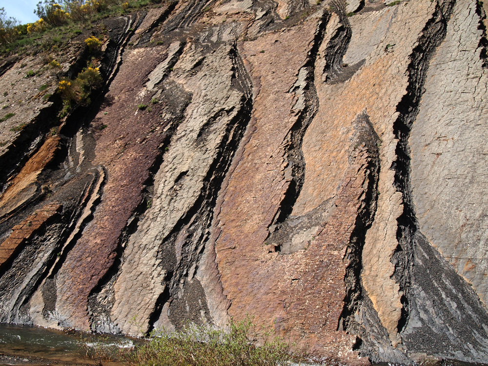 In this context of the changes in the Varica orogeny, sediments are formed and they are the rocks that surface today in "El Ribero Pintado". These sediments came from erosion of the mountain range which is being formed. There are significant emerged reliefs and there is also an equatorial climate, that’s why rivers carry large amounts of sediment that accumulate in the sea. These sediments will result in detrital sedimentary rocks (they come from water-insoluble sediments, sand, clay ... - moved by erosion and deposited by gravity. These rocks are classified by the size of their clasts, which is the basics of the distinction between conglomerates, sandstones and argillaceous rocks). In the case of “El Ribero Pintado” is a rhythmic alternation of layers of sandstone and shale. It is likely that these rocks were deposited in a steep slope bordering the continental shelf and were brought there from other marine areas by turbidity currents caused by storms, earthquakes or by the destabilization of sediments accumulated at the edge of the platform. All these processes are very common in areas of active tectonics, as the Variscan orogeny was. |
